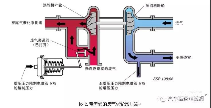 增压束缚电磁阀N75的压力操纵是通过动员机操纵单位ECU操纵的。正在有排气旁通阀的涡轮增压器体例中,电磁阀会依据动员机操纵单位ECU的指示操纵大气压的开启韶华。依据增压压力和大气压力发作感化于压力罐上的操纵压力。排气旁通阀取胜弹簧压力,废气流分手。从涡轮的一局限流,另一局限的废气旁通阀进入排气管的办法是不应用的。当电源欠亨时电磁阀将封闭,增压压力就直接感化于压力罐。