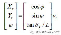 2.运动学状况空间模子遵照车辆运动学方程,将车辆运动状况体系看作一个输入u=[v,δ]^T以及状况参数X=[x,y,φ]^T的限制体系。可示意为: