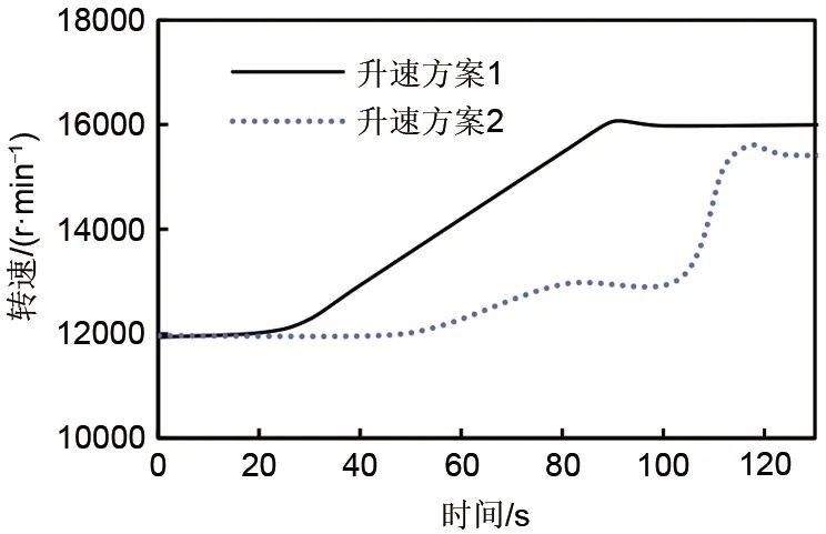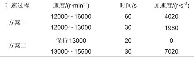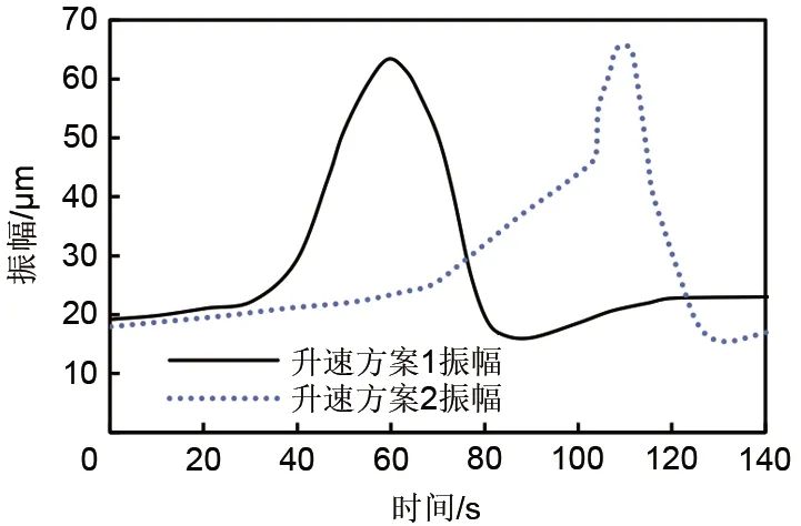 正在压缩机、膨胀机实质运转时,因为机组计划央浼、现场前提纷歧概起因,运转时往往采用差别的升速战略。本文采用线性联贯升速和阶梯升速两种计划,比力了两种差别升速计划境况下,转子通过临界转速时的振动转折境况。表1给出了两种升速计划的周到消息。图14给出了两种差别的通过临界转速的计划。计划一中转速直接由12000 r/min提速到16000 r/min,提速时光为60 s,转速加快率为4020 r/s。计划二中转速起初由12000 r/min擢升到13000 r/min,提速时光为30 s,并中断了约20 s,之后转速由13000 r/min提速到15500 r/min,用时30 s,转速加快率为7020 r/s。