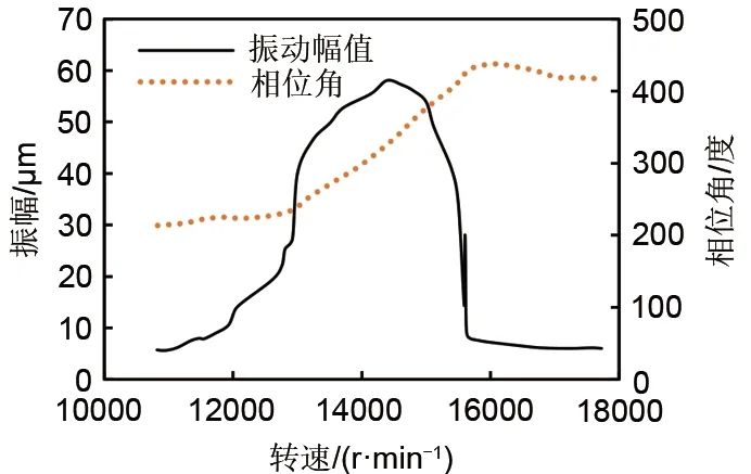图11给出了转子振幅和相位角随转速转折弧线(伯德图)。从图中可能看出,从10000 r/min提速到16000 r/min经过中,相位角转折了180°以上,况且正在14200 r/min驾驭崭露了明白的振动峰值,解说转子全部地超出了14000~14500 r/min相近的临界转速,即转子正在14000 r/min驾驭存正在临界转速。