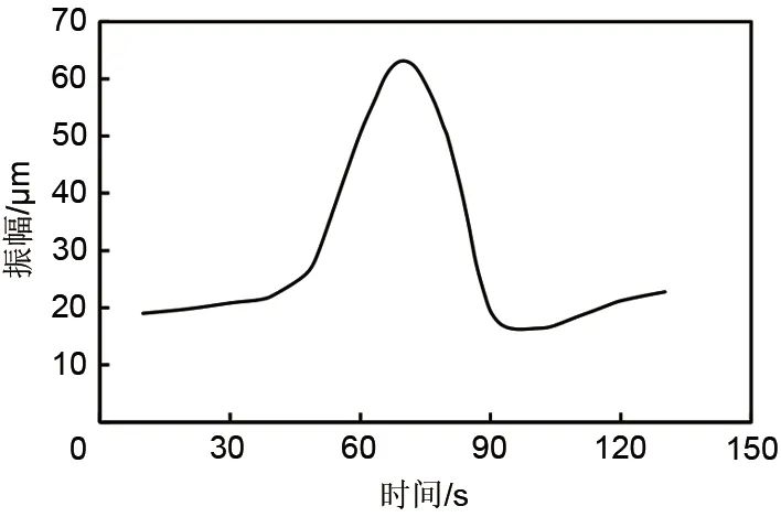 起初阐明通过14200 r/min时转子的振动转折纪律,图8给出了升速经过弧线 r/min直接升速到15500 r/min,升速时光为60 s。图9给出了该升速经过中转子振动的转折纪律。由图可知,正在转速由12000 r/min升到14200 r/min经过中,纵然只经验了30 s,然则振幅赶疾由22 μm升到66 μm,当转速无间升高到15500 r/min时,振幅值又赶疾低落到20 μm以下,该振动形象适宜轴系过临界转速时的振动特性。维系图8和图9还可能看出,振动峰值对应转速前后的共振区域局限分裂约为15%和9%,可睹对待本文的咨议对象,振动峰值前的共振区域要大于振动峰值之后的共振区域。