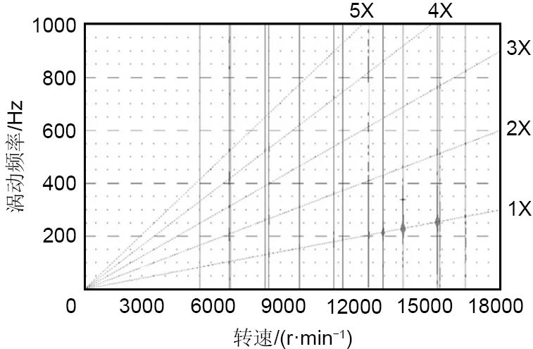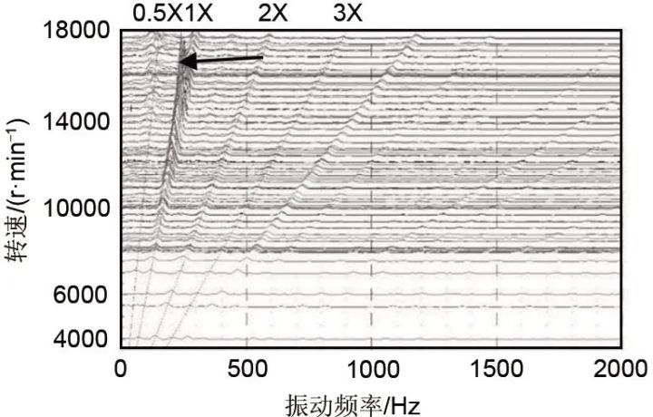 图13给出了转子振动的频谱瀑布图(级联图),从中可能越发直观地看出,一倍频为转子的厉重振动频率,且箭头所指地位为振动峰值,此时的对应转速为14200 r/min。由此可能全部确定,该转子正在14200 r/min驾驭存正在临界转速。