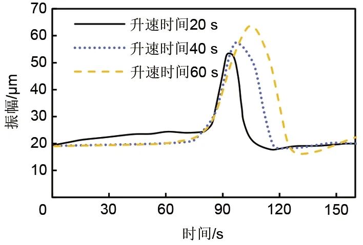 表面上,通过临界转速时,升速越疾,振动峰值越低,然则受到动力前提和其它少少要素的影响,转速擢升的速率会受到限制。是以本末节将探究通过临界转速时,升速时光对转子振动幅值的影响。图16给出了过临界转速时,3种差别提速计划下的振幅弧线 r/min的提速时光分裂为20、40和60 s,转速加快率分裂对应12000、6000和4020 r/s。从图中可能看出,提速时光从20 s耽误到60 s时,振动峰值从51 μm补充到61 μm,擢升了约20%,况且振动幅值的擢升近似线性。