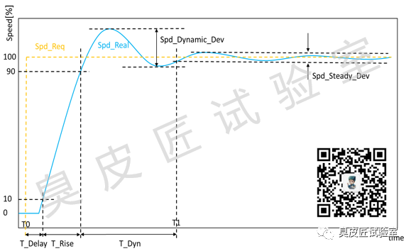 此中,Spd_Req为需求转速,Spd_Real为现实转速,T0时期体例接受到哀告转速的指令音讯,始末一段延迟时期T_Delay,现实转速抵达需求转速的10%,再始末必然的上升时期T_Rise,现实转速抵达需求转速的90%,转速再上升到最大值随后减小(此中,最大值与最小值之间是转速动态谬误Spd_Dynamic_Dev),就云云现实转速沿着需求转速上下震动,始末T_Dyn,达到T1时期,现实转速的震动限制达到容差限制内,这个容差限制也即是转速静态偏差Trq_Steady_Dev,遵循静态偏差,可能算出谬误的百分比,这个流程中转速响合时间为T_Delay+T_Rise+T_Dyn。
