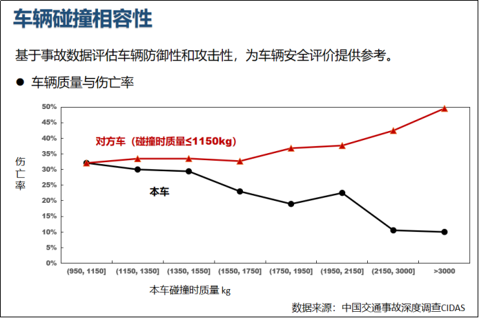 起首来看碰撞两边车辆质料与乘员伤亡率的干系。如下图所示,可能看到,跟着本车质料的上升,本车乘员的伤亡率低落,但对方车(质料≤1150kg)的伤亡率上升明显,两车的总伤亡率显现伸长趋向。碰撞两边的质料差异越大,事项的总伤亡率及质料小的一方的伤亡率均更高。也便是说,出于普及自车安闲性而增进自车质料的做法就庇护和改良具体安闲而言并不行取。交通事项中的碰撞两边车辆必要具有必然的相容性,尽量省略两者的质料差异。