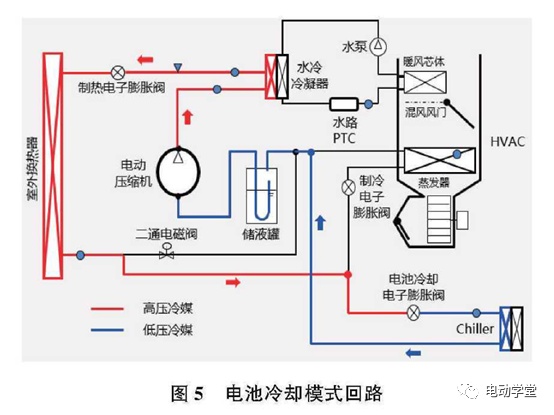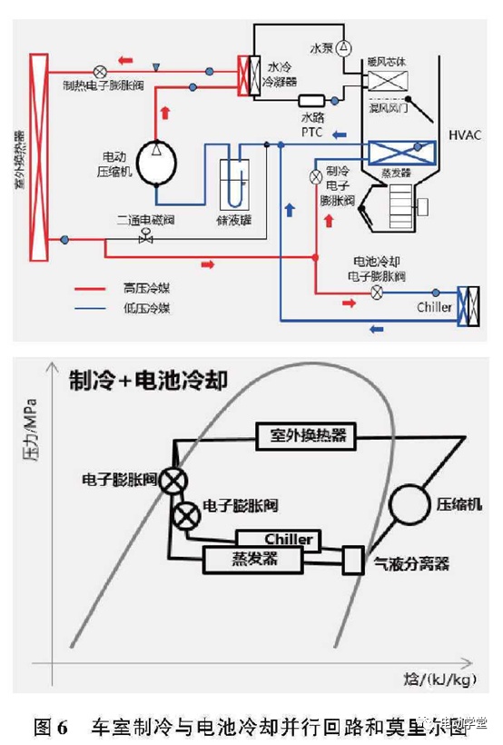 图5所示为电池冷却形式回途图(莫里尔图参考制冷形式)。与制冷形式回途相同,正在室外热调换器中放热冷凝后的制冷剂,电池冷却电子膨胀阀职掌减削降压,酿成低温低压状况,经由Chiller吸热蒸发,从而冷却电池冷却液。