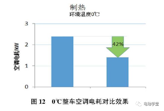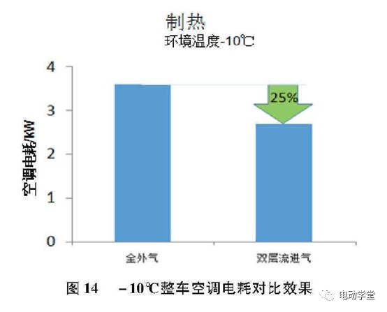 正在冬季,为避免开空调时前风窗玻璃起雾,凡是采用全外轮回形式进风。这样一来整车制热负荷极度大,导致空调电耗广大,要紧影响纯电动汽车的续驶里程。为此咱们正在热泵体系的根基上斥地了双层流HVAC总成,对体系举办高效集成行使,同时对双层流HVAC总成和通常HVAC总成正在整车上的节能发挥举办电耗比照,如图14所示。比拟通常HVAC总成,双层流HVAC总成正在制热时可节流电能25%。从测试结果看出,双层进气形式可明显消重整车制热负荷,正在冬季制热告终最大水平的节能后果。