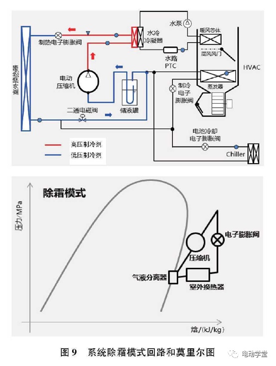 正在制热形式下,室应酬换器处于吸热蒸发状况。当室外温度低于0°C,长工夫操纵会导致室外热调换器外观呈现结霜气象。结霜后,室外热调换器的热调换作用就会低重,制热才智和作用也就低重,于是必必要探求相应的除霜手腕。图9所示为体系除霜形式回途图及莫里尔图。结霜后需正在车辆泊车时举办除霜。除霜时,与制热形式回途相同,但此时室外热调换器电扇和HVAC电扇搁浅运转,制热电子膨胀阀开度较制热形式时更大,于是室外热调换器的压力会随之上升,使室外热调换器温度越过0°C,到达除霜的宗旨。