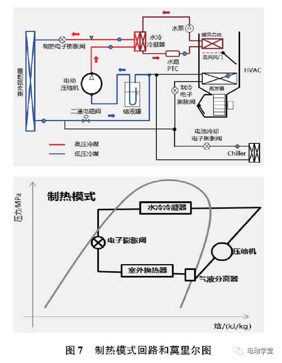 图7所示为制热形式回途及莫里尔图。从压缩器吐出的高温高压的制冷剂气体通过水冷冷凝器向空调冷却水放热冷凝,空调冷却水被加热后,通过暖风芯体放热,告终车室内制热。冷凝后的制冷剂则经由制热电子膨胀阀职掌减削降压,成为低温低压状况,通过室外热调换器从大气中吸热;然后由储液分辨器告终气液分辨,并将分辨后的制冷剂气体再送至压缩机内。