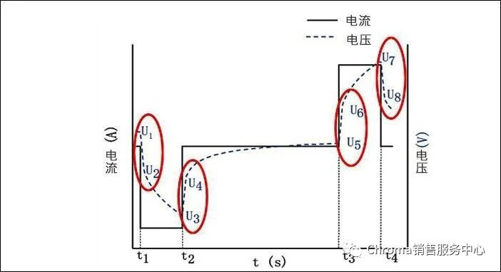 Chroma 17010充放电测试计划供给1mS瞬时取样功效,能无误撷取电性测试中的瞬态转化,(图三)各红圈处;搭配Chroma Battery LEx测试软件中容易工步编辑直接输入SOC%举动测试点,让应用者可神速拟定出无缺HPPC测试方针,再藉由内筑变量界说功效与软件四则表达式编辑自愿揣测出欧姆电阻(Ro)与极化电阻(Rp)结果,并直接显示于测试报表中,让整个操纵化繁为简,且餍足悉数测试需求。