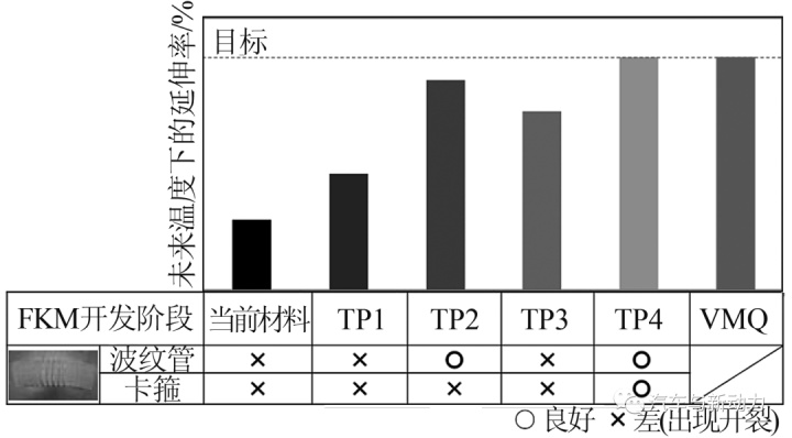 图5为FKM内层和VMQ外层正在室温和改日启发机境遇温度下的延长系数斗劲结果。看待VMQ外层,当温度由室温升高至改日启发机境遇温度时,其延长系数降低50%。而FKM内层的延长系数降低25%。每每以为,延长系数低于100%时,橡胶质料就已到达其寿命极限。即使正在而今温度下,FKM内层不行题目,但其正在改日温度下的延长系数会低于100%。