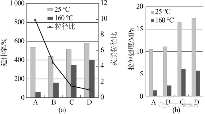 如图8所示,合于延长系数和拉伸强度特色的咨询结果证实,通过变换炭黑类型,能够告终力学本能的改进。炭黑粒径越小,本能的改进幅度越大。展示这种结果的来历是炭黑皮相积增大,导致形成更众的凝胶,从而使汇集获得加强。