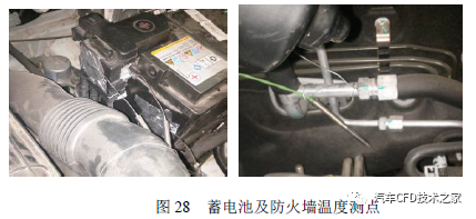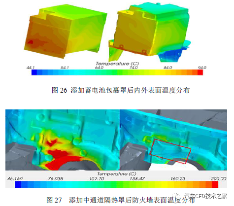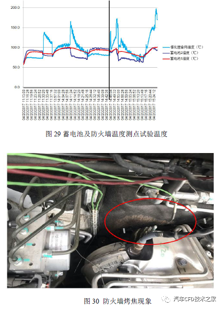 正在未增加蓄电池包裹罩、中通过隔热罩前起首验证了2 处的温度值,试验结果(图29)显示,蓄电池轮廓温度最高达100℃,防火墙最高温度达200℃,而且试验后防火墙呈现烤焦景象(图30),存正在告急热害危急,这与仿真结果同等。