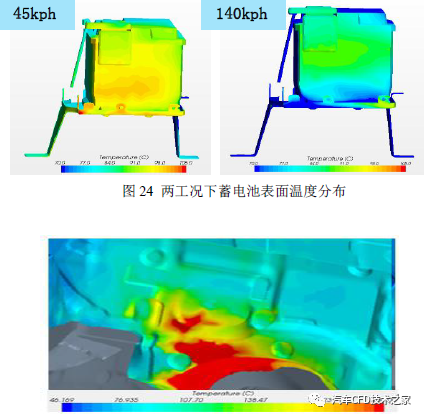 仿真理会呈现蓄电池、离排气管较近的防火墙邻近存正在热害危急。蓄电池极限作事温度为90℃,图中显示45km/h 工况下,蓄电池轮廓温度高达105℃,如图23;防火墙极限作事温度为200℃,图24 中赤色区域轮廓温度均凌驾200℃。