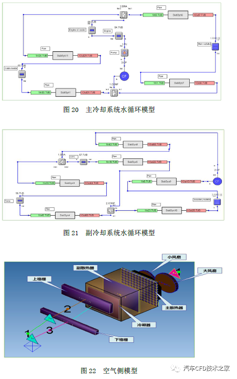 基于整车空调及冷却编制道理图搭筑一维水侧理会模子(图20-21),氛围侧模子基于三维CFD流场仿线)。