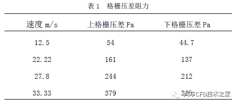基于三维机舱流场理会结果,能够得出上下格栅后的压力吃亏值(如表1),及Cp 值,高车速下,Cp 值分歧为0.65、0.52,进气面积分歧为0.0454m²、0.0291 m²。