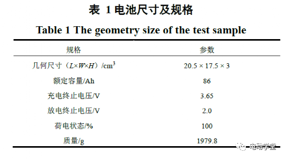 如图1和表1所示,尝试样品为储能用86Ah磷酸铁锂电池单体,尺寸为205mm×175mm×30mm,质料为1979.8g,额定电压为3.65V,容量为86Ah。采用功率为500W的加热板触发尝试电池热失控。加热板与电池两侧均安置导热系数较小的保温棉外侧用夹具夹紧,保温棉的效率其一是删除加热板-电池系统向外界的散热,其二是柔性挤压能够用来毁灭电池与加热板之间的接触热阻。