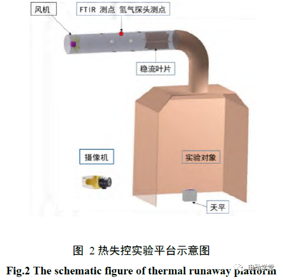 锂离子电池热失控尝试平台的机闭如图2所示,除了测温装备,正在尝试平台外设有高清摄像装备用于搜集热失控历程中的视频素材。采用天平及时搜集电池与加热板系统的质料变动。当泄压阀翻开后,出现大批气体,风机出现的负压使得电池出现的气体经递次颠末稳流叶片,FTIR测点,氢气探头探点,末了排出到外界情况。FTIR与独立的氢气探头能够对热失控产气品种与产度量实行及时的监测。稳流叶片的效率正在于将集烟罩搜集的热失控气体匀称夹杂,从而担保FTIR探点与氢气探头的探测精确性。