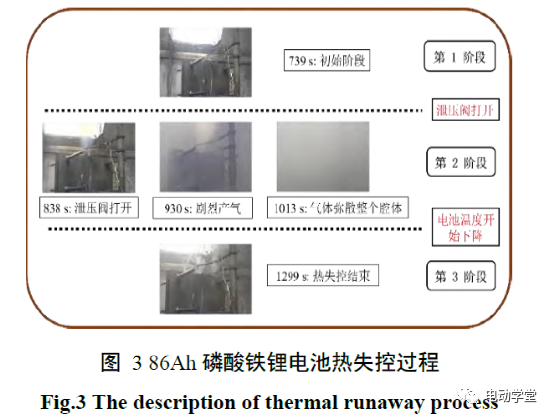 正在全尺寸燃烧测试平台的根柢上,本琢磨对电池的热失控作为实行了拍摄纪录。将100%SOC电池的热失控作为分为以下三个阶段图4所示: