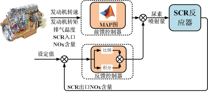 (2)闭环左右将SCR出口的NOx含量通过传感器反应到左右单位,行使经典反应左右布局即可达成NOx的闭环左右。闭环左右布局如图3所示。闭环左右采用比例积分(Proportio