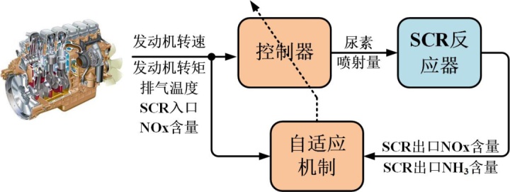 (3)自适当左右自适当左右的根基起点是仿人的智能以达成对繁复体系举办有用的左右, 它具有从处境自练习、适当处境的本领,实用于管理SCR体系中的非线性和不确定性题目。尿素喷射自适当左右布局如图4所示。文献[10]安排了一种自适当PI左右器,并举办了尝试测试,声明了正在氨遁逸低于10ppm的处境下,自适当PI左右器的NOx转换效力可能抵达90%。文献[11]则引入了一种模子参考自适当左右体系。该体系中采用一阶模子举动SCR参考模子,并安排了自适当机制来更新体系参数。