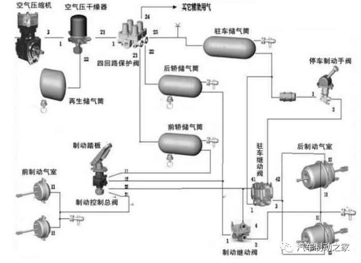 为阐述体系压力对其制动反当令间的影响,最先阐述商用车制动体系道理,由图3某商用车制动体系道理图可能知晓,发起机鼓动氛围压缩机发作必定压力的气体,经干燥器除去水分后通过四管道维护阀进入储气瓶,前桥制动管道气流过去桥储气筒经串联式双腔制动阀下腔输入口和输出口,再始末疾放阀,结尾达到前桥阁下制动气室。后桥制动管道气流从后桥储气筒经串联式双腔制动阀上腔的输入口和输出口,达到后桥阁下弹簧制动气室的膜片腔,使车辆处于制动或者消除制动形态。