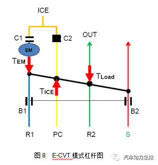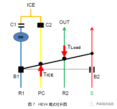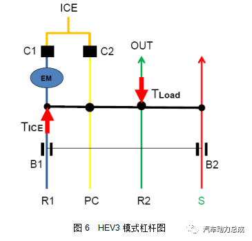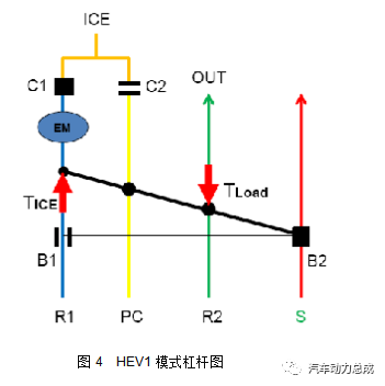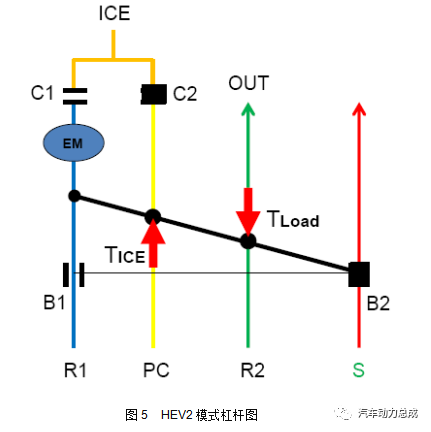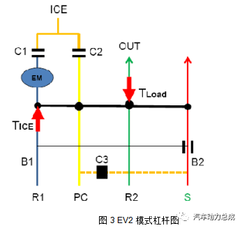 此形式下n3的转速行动已知条款,它由车速决断。n3是个区间值,假设带头机启动时的车速为v01,由HEV1形式进入HEV2形式时的车速为v12,那么n3位于v01和v12确定的转速之间。HEV2:该形式下起影响的选换挡元件是B2和C2,带头机通过C2结合到行星架上,B2锁止太阳轮行动支点,其杠杆图如下: